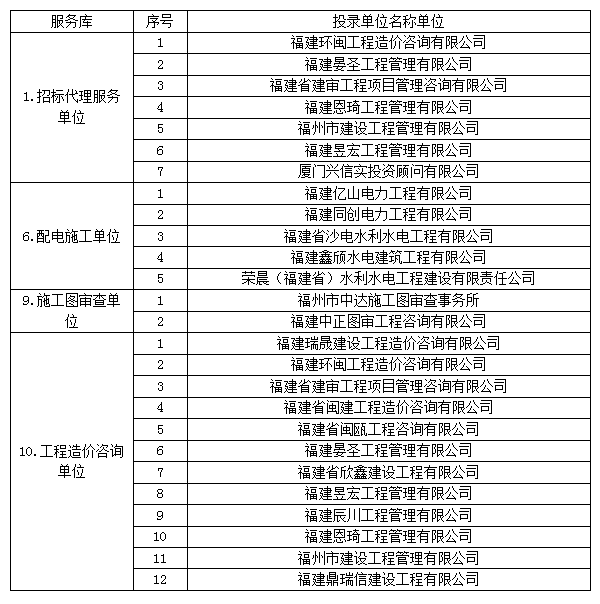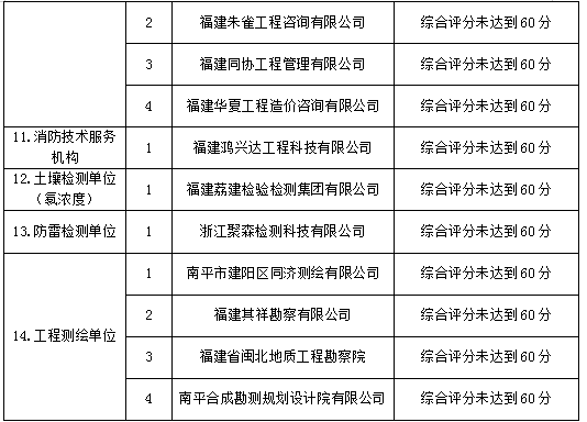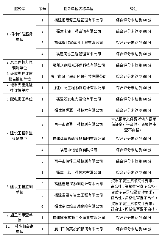 南平綠發(fā)集團有限公司2023年服務(wù)庫招錄于2023年7月26日08:30時在福建暉源工程咨詢有限公司評審,經(jīng)評審委員會對投錄文件進行評審,現(xiàn)將結(jié)果公示如下: 一、服務(wù)庫備選單位: 二、服務(wù)庫后補單位: 三、不合格單位及原因 如投錄人對結(jié)果有異議,請于公示期時間:2023年7月28日起至2023年7月31日內(nèi)以書面形式(蓋法人單位公章和法定代表人簽字,并注明聯(lián)系人、電話、地址)向南平綠發(fā)集團有限公司反饋,逾期不予受理。 聯(lián)系人:謝女士,聯(lián)系電話:18988475010 聯(lián)系地址:南平市建陽區(qū)寶山路15號林業(yè)賓館南平綠發(fā)集團有限公司(武夷新區(qū)辦事處) 。 招錄人:南平綠發(fā)集團有限公司 代理人:福建暉源工程咨詢有限公司 2023年07月28日