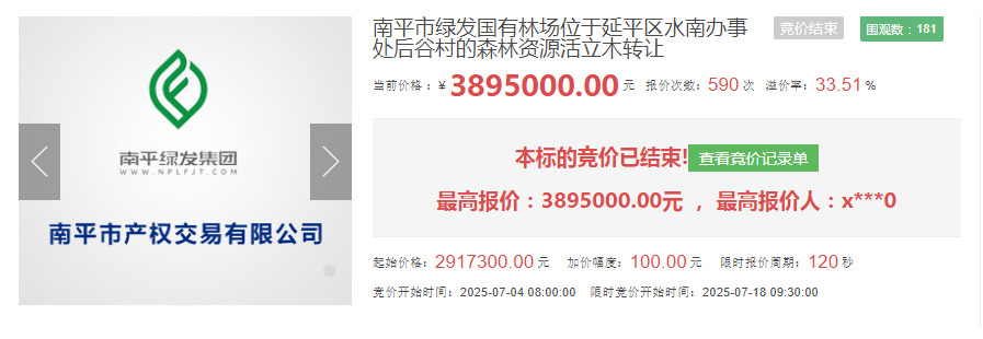 近日,延平區水南辦事處后谷村的森林資源活立木轉讓項目在南平市產權交易有限公司溢價成交。此次標的掛牌價291.73萬元,成交價389.5萬元,溢價97.77萬元,溢價率33.51%,是南平市產權交易有限公司打造南平市綜合性要素平臺,不斷拓寬交易品種,下沉服務重心的有效嘗試。 鑒于林木資源項目的特殊性與復雜性,產權公司充分發揮專業平臺優勢,嚴格遵循相關法律法規和交易規則,確保了每一個環節的公正、公平、公開。通過廣泛的信息發布和精準的市場推廣,吸引了大量潛在投資者的關注,征集到6家意向受讓方,有效提升了交易的活躍度和競爭性。 此次林木資源高溢價成交是南平市產權交易有限公司服務林木資源交易的具體舉措,也是破除區域壁壘,服務全市經濟的一成功實踐。下一步南平市產權交易有限公司將立足平臺優勢,激發多要素交易活動,深入探索和創新資源交易模式,推動“資源”變“資金”。 內容來源|南平市產權交易有限公司 初審初校|葉文龍 復審復校|徐 志 終審終校|涂洪彬 |